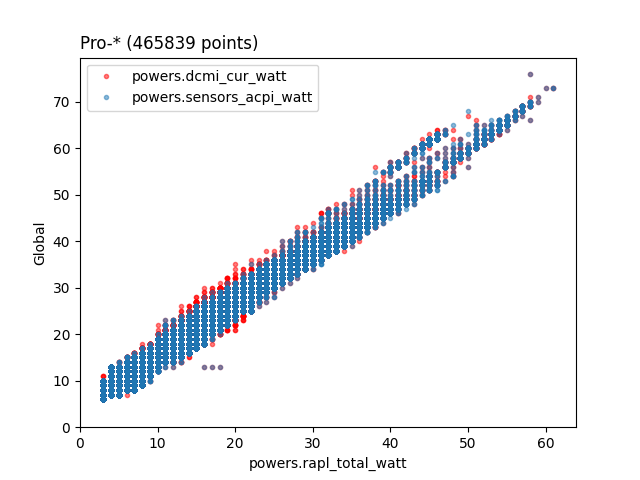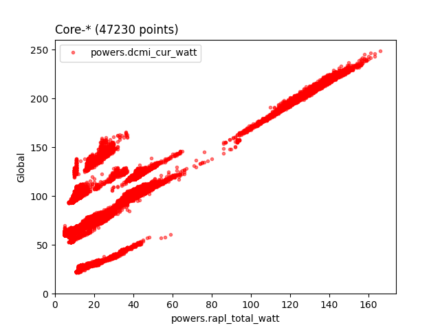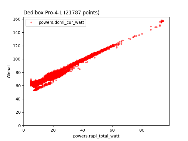 Sur les Intel Xeon E3 et E5, RAPL semble donner une très bonne évaluation de la consommation électrique variable d’un serveur. Sur un jeu de données de 150 serveurs, mesurés toutes les 10 secondes pendant 4 mois, et moyennés par heure, RAPL est parfaitement linéaire avec la consommation globale…