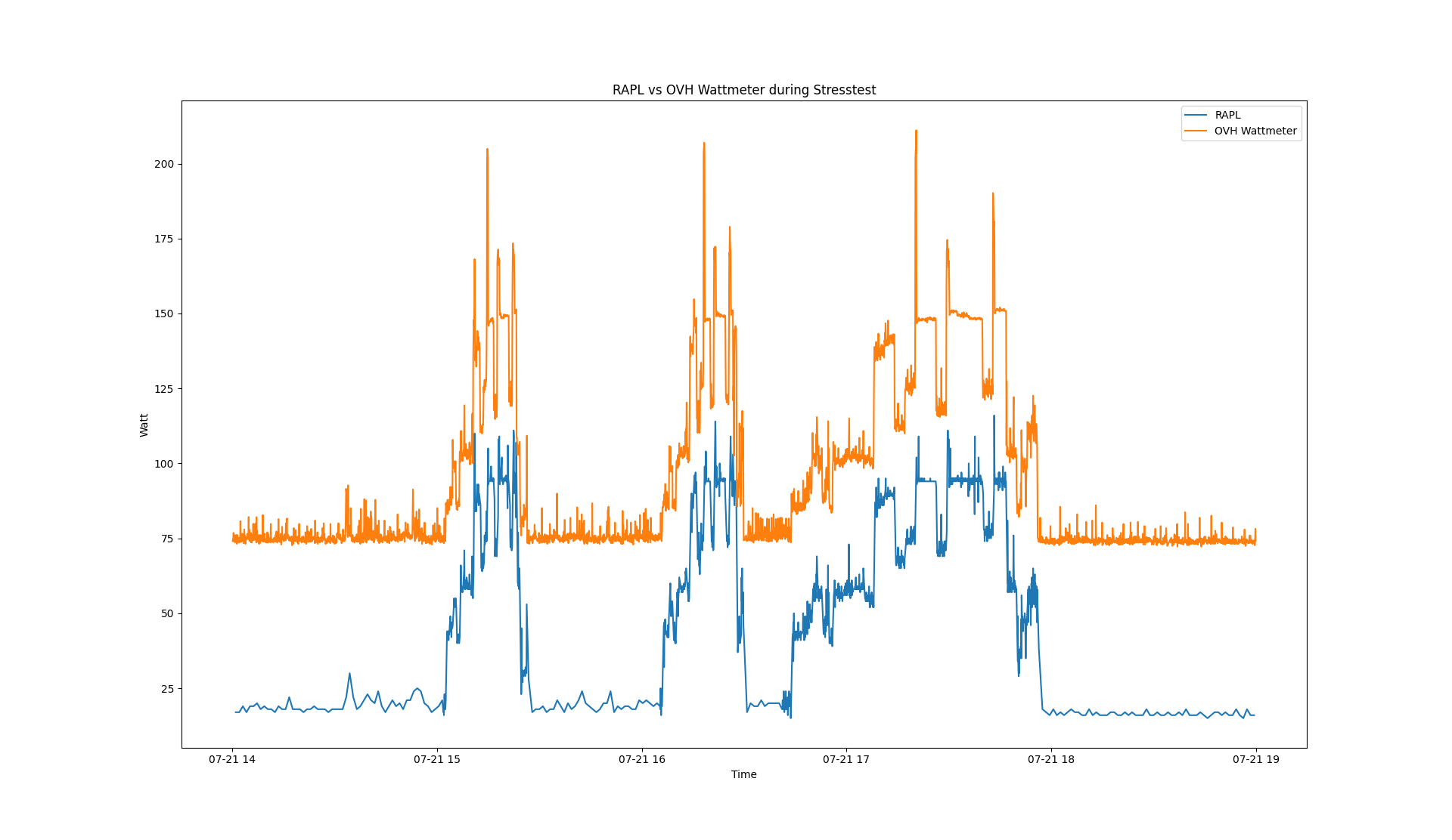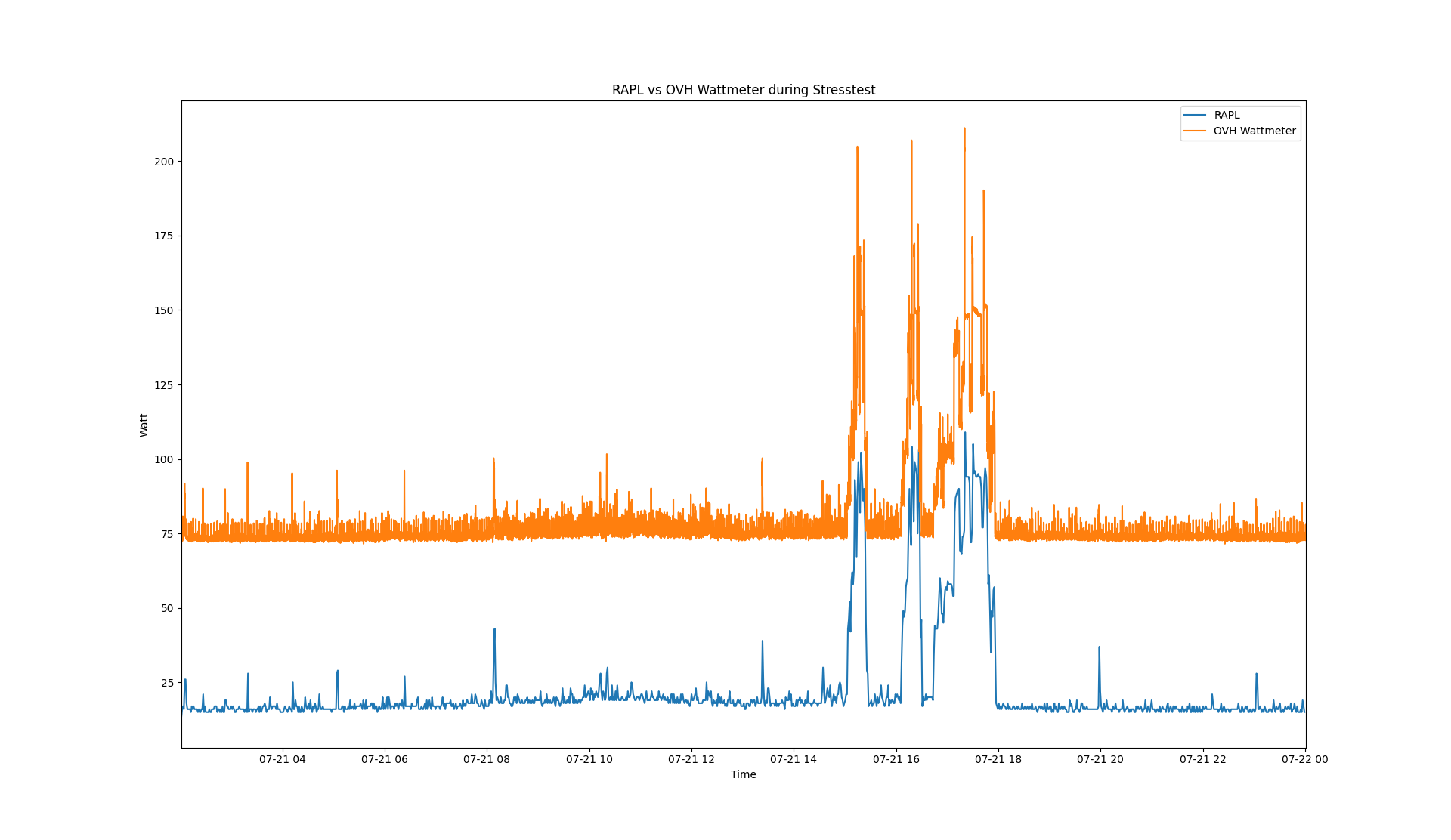 Pour en avoir le cœur net, nous avons aussi mené une étude sur un serveur OVH connecté à un wattmètre (précision +/-5W). Nous avons mesuré la consommation électrique toutes les 5 secondes sur une journée, et lancé divers stress tests pour provoquer des variations :